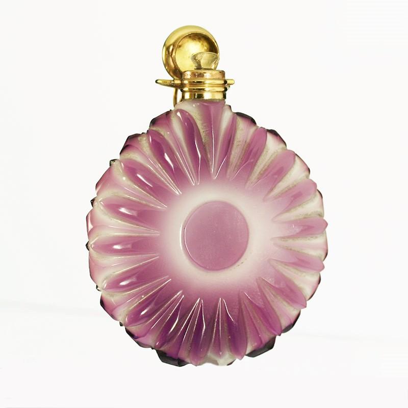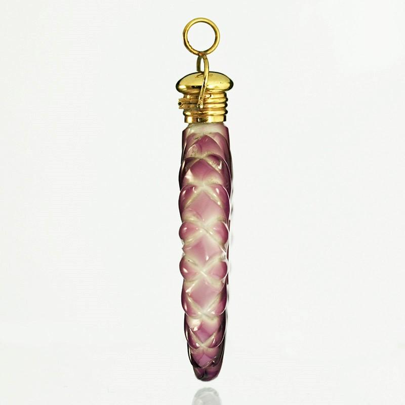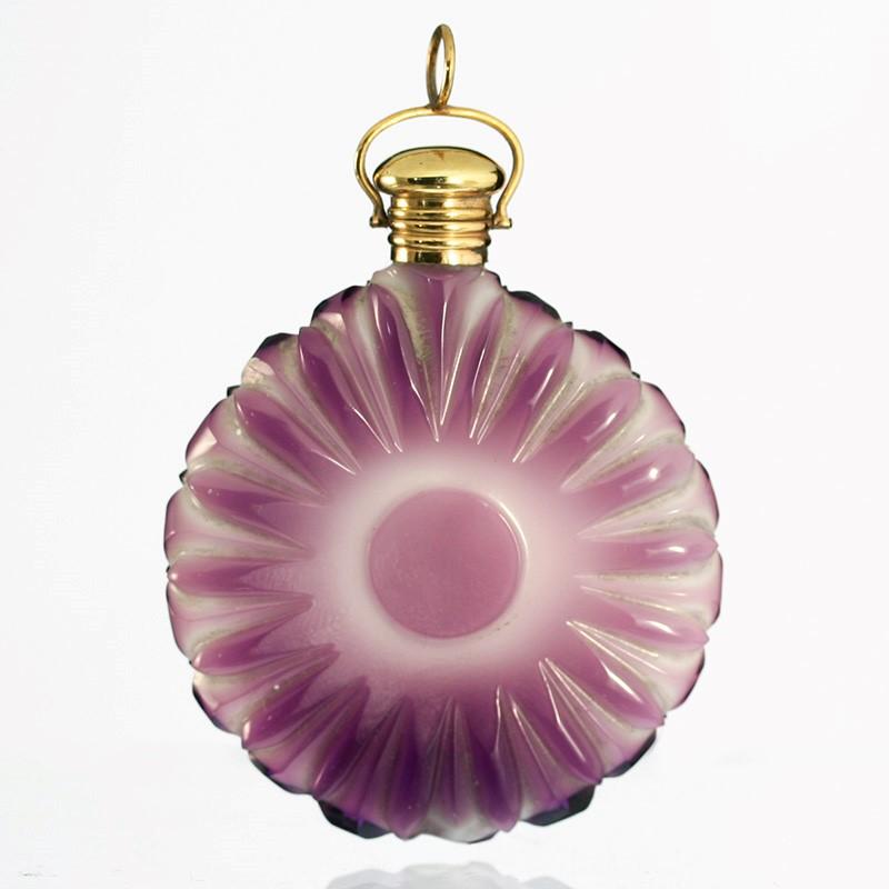 c.1838 French amethyst over white glass scent perfume bottle, silver gilt top