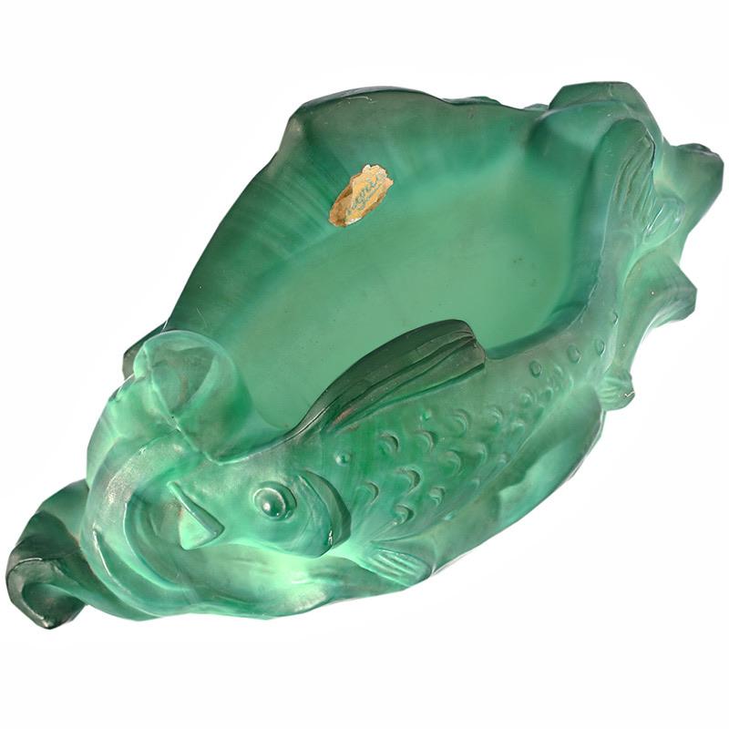 ENQUIRE ABOUT C.1930S SCHLEVOGT INGRID MALACHITE GLASS DISH WITH FISH MOTIF