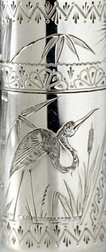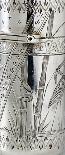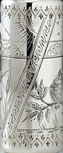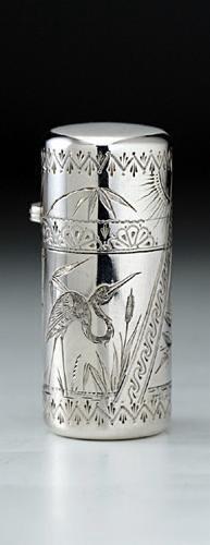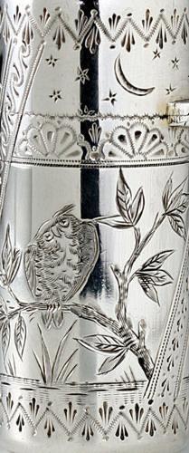 ENQUIRE ABOUT 1881 SAMPSON MORDAN SILVER SCENT PERFUME BOTTLE ENGRAVED WITH HERON & OWL IN THE AESTHETIC STYLE