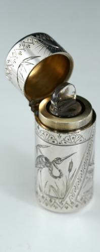 1881 SAMPSON MORDAN SILVER SCENT PERFUME BOTTLE ENGRAVED WITH HERON & OWL IN THE AESTHETIC STYLE