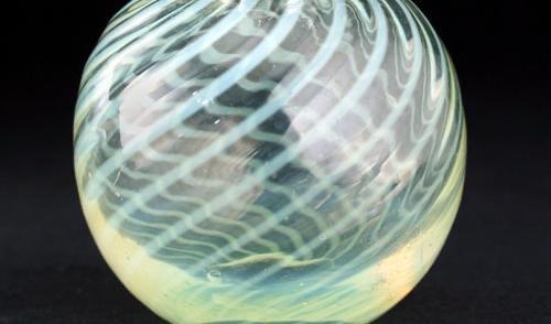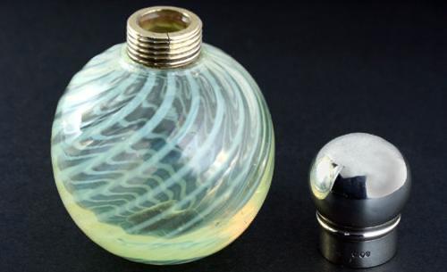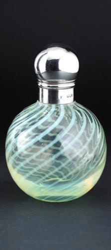 ENQUIRE ABOUT 1882 SAMPSON MORDAN VASELINE URANIUM GLASS SCENT PERFUME BOTTLE WITH OPALINE PIPING, PROBABLY WALSH