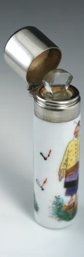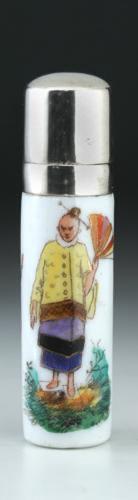 ENQUIRE ABOUT C.1890 PORCELAIN CYLINDER SCENT BOTTLE WITH POLYCHROME CHINESE FIGURES MOTIF