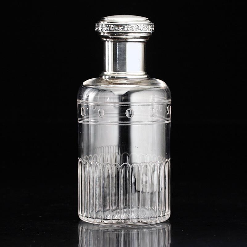 c.1910 French engraved crystal dressing table scent perfume bottle, silver top