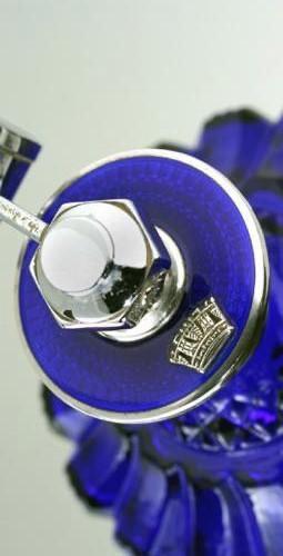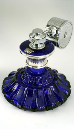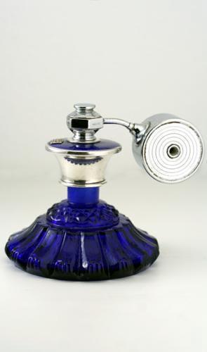 ENQUIRE ABOUT C.1930S MOULDED COBALT GLASS SCENT PERFUME ATOMIZER SPRAY WITH COBALT GUILLOCHE TOP