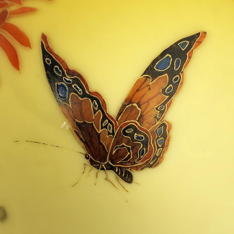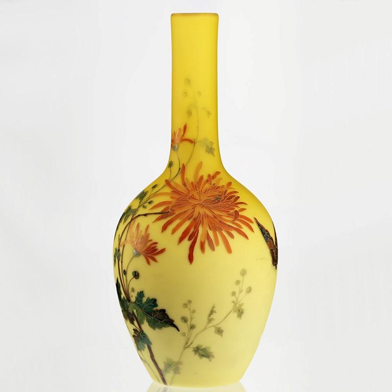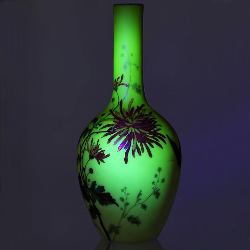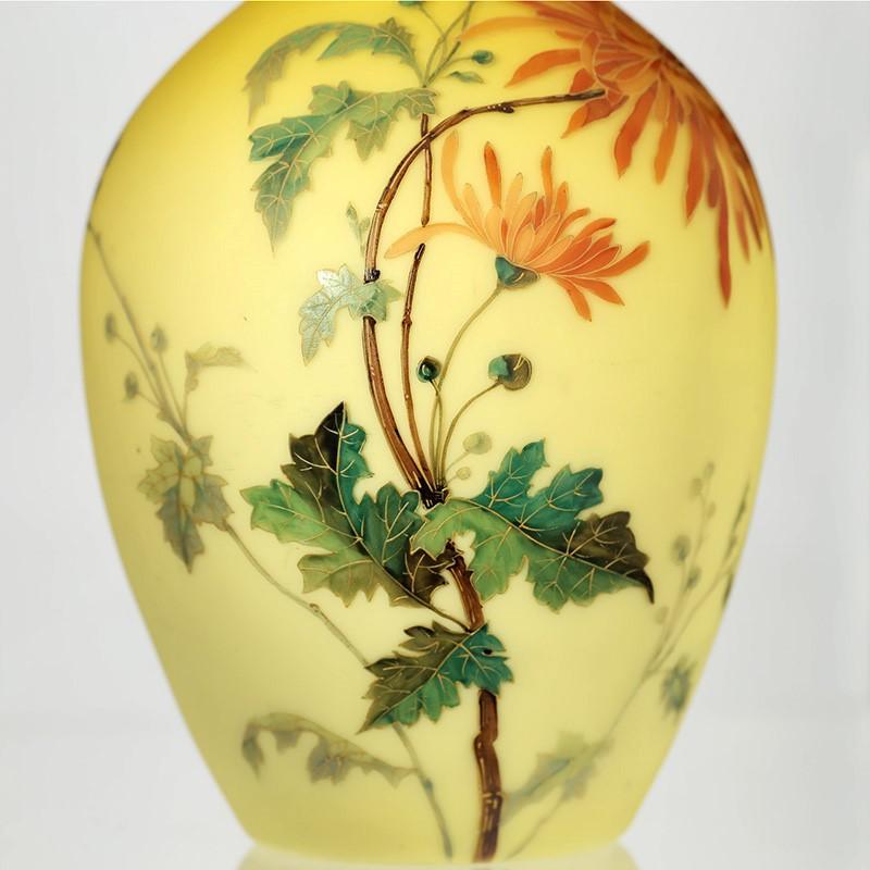 c.1900 floral enamelled shaded uranium lemon satin glass vase, Thomas Webb