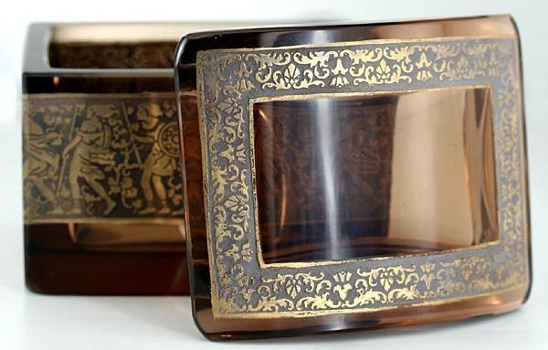 c.1910 MOSER KARLSBAD AURORA BROWN GLASS BOX & COVER WITH AMAZONIAN FRIEZE, SIGNED