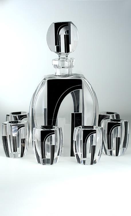c.1930s Czech linear cut & enamelled deco decanter & 6 glasses, Palda or Posselt