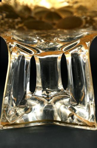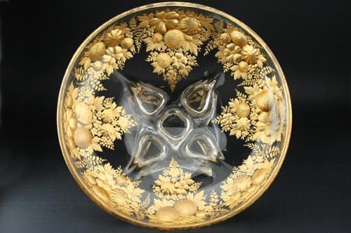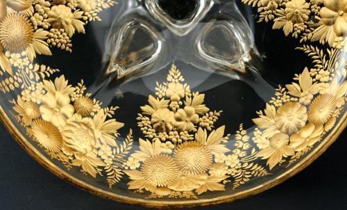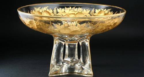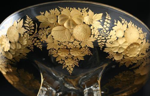 ENQUIRE ABOUT FINE C.1900 REVERSE INTAGLIO ENGRAVED & GILDED GLASS COMPORT DISH CENTREPIECE, POSSIBLY MOSER