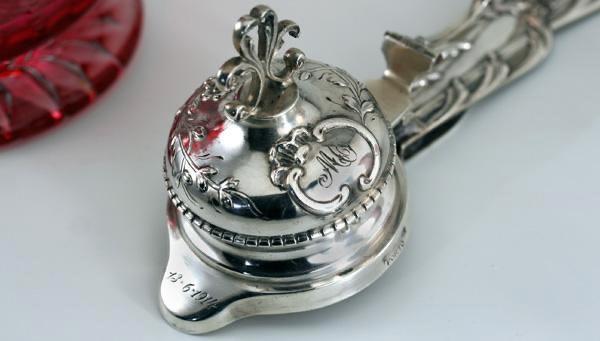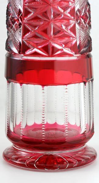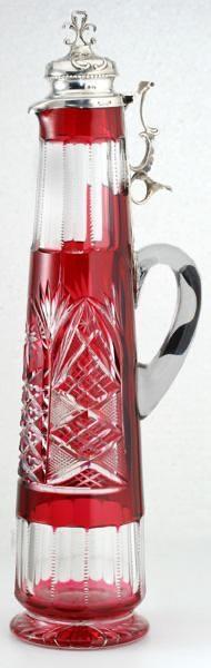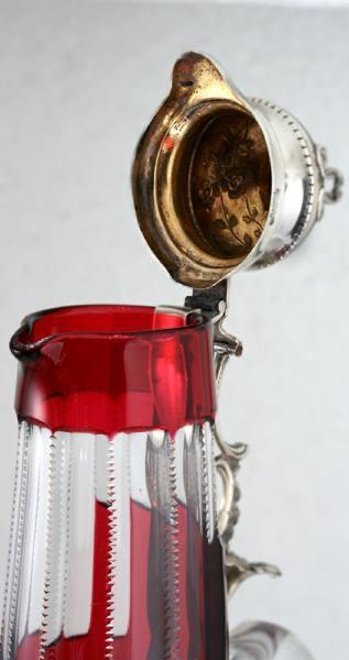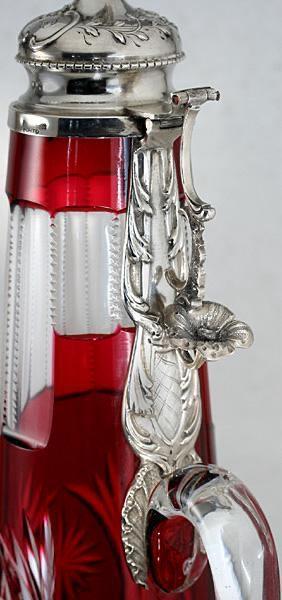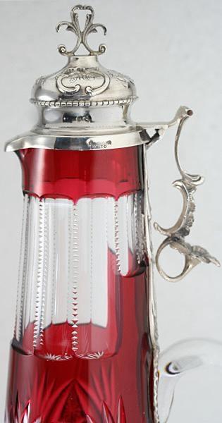 c.1908 VAL ST. LAMBERT CRANBERRY OVERLAY CRYSTAL WINE JUG, 1914 PORTUGUESE SILVER TOP