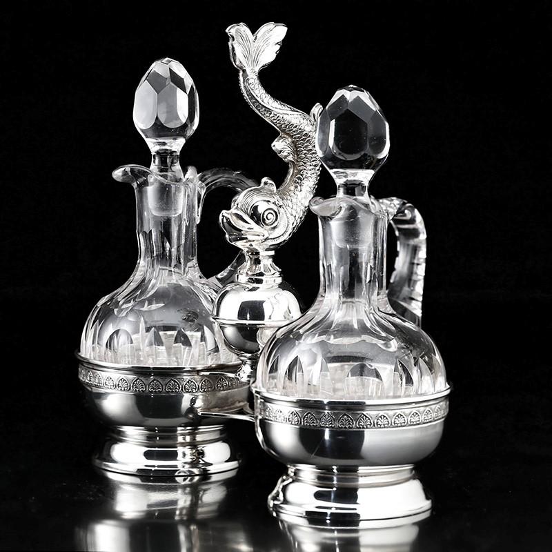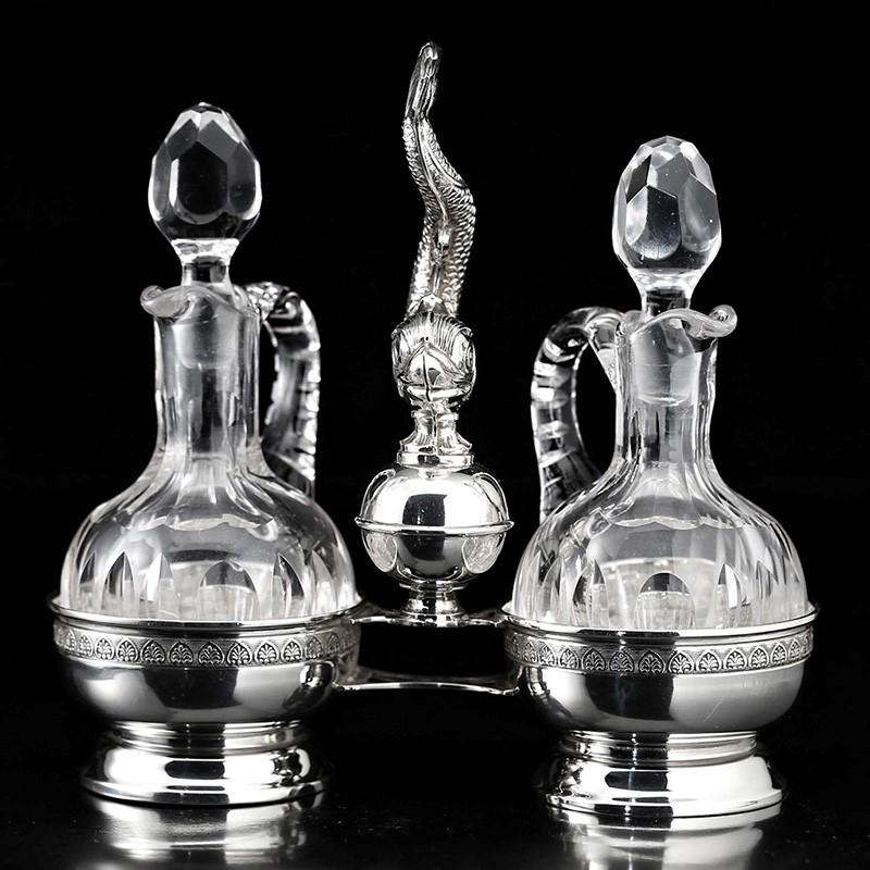 ENQUIRE ABOUT C.1950S SPANISH CUT CRYSTAL CRUET SET IN SILVER DOLPHIN HOLDER