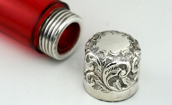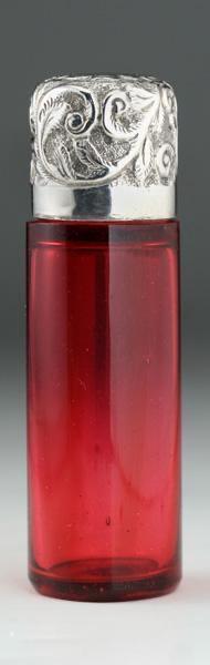 ENQUIRE ABOUT 1892 RUBY GLASS CYLINDER SCENT PERFUME BOTTLE, EMBOSSED SILVER TOP