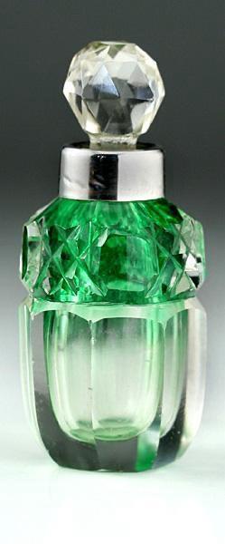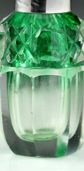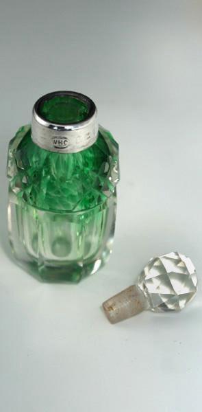 1904 GRADUATED GREEN CUT CRYSTAL SCENT PERFUME SMELLING SALTS BOTTLE, SILVER COLLAR