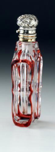 ENQUIRE ABOUT C.1880 FRENCH CRANBERRY OVERLAY CUT CRYSTAL SCENT PERFUME BOTTLE, SILVER TOP