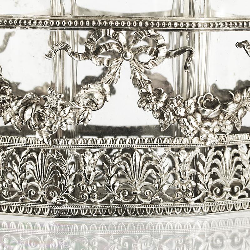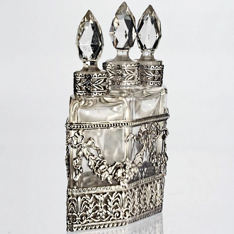 c.1880 French crystal scent perfume bottle trio in plated holder