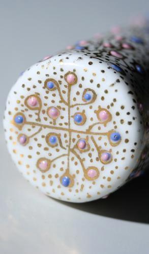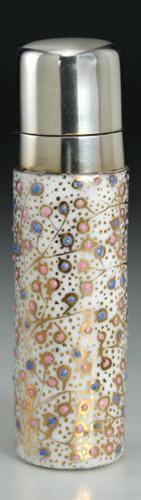 ENQUIRE ABOUT C.1880 RAISED ENAMEL DECORATED PORCELAIN CYLINDER SCENT PERFUME BOTTLE