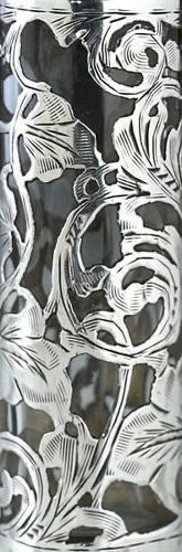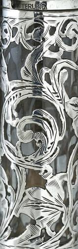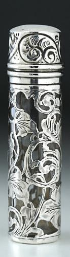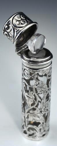 c.1900 PIERCED STERLING SILVER OVERLAY GLASS SCENT PERFUME BOTTLE, PROBABLY AMERICAN