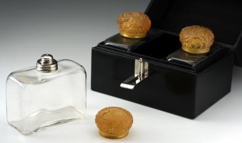 c.1920s/30s DECO LEATHER CASED SET OF THREE SCENT PERFUME BOTTLES WITH CARVED TOPS