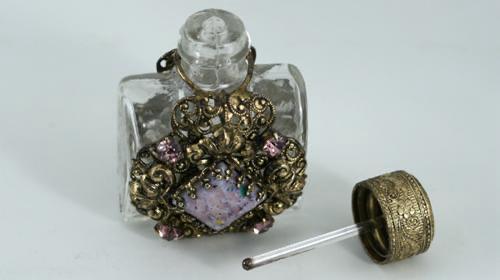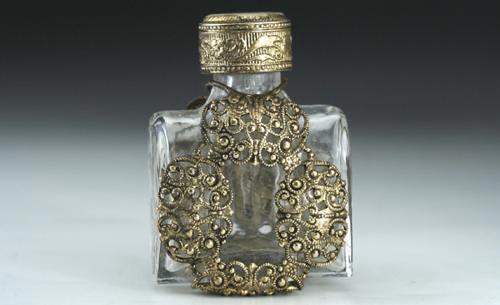 ENQUIRE ABOUT C.1950S FILIGREE CAGED AND JEWELLED CZECHOSLOVAKIAN SCENT PERFUME BOTTLE