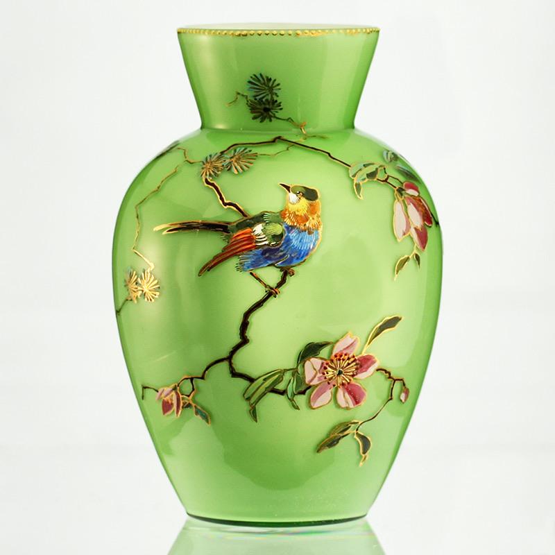 c.1900 cased green glass vase with enamelled bird & flora, Harrach